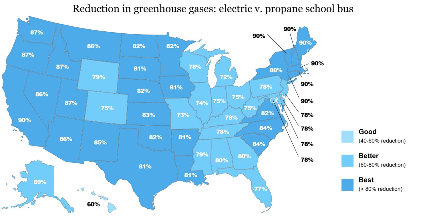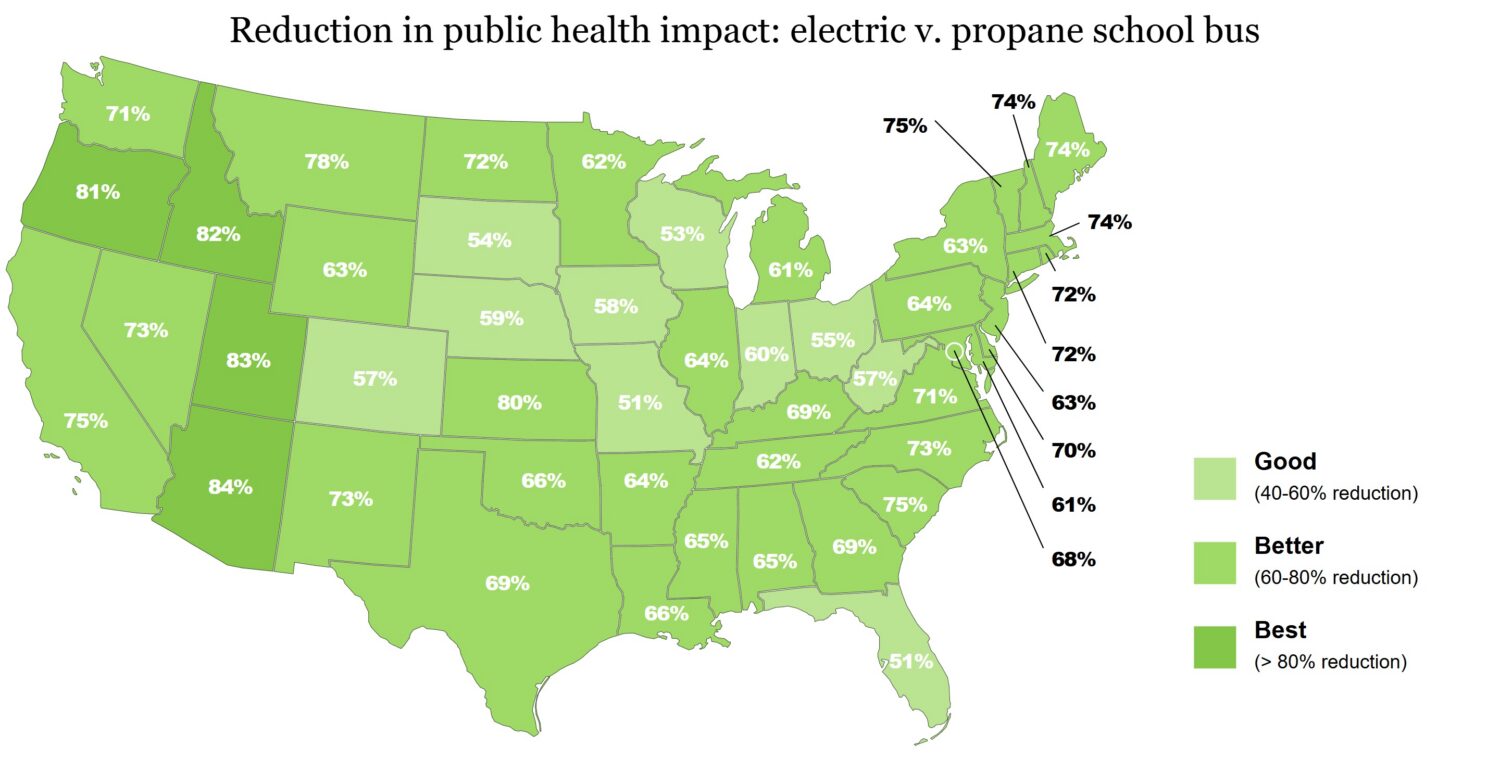 Note: Percentages represent the reduction in greenhouse gases and public health impact of an electric school bus compared to equivalent propane school bus. Public health related data for AK and HI were unavailable.