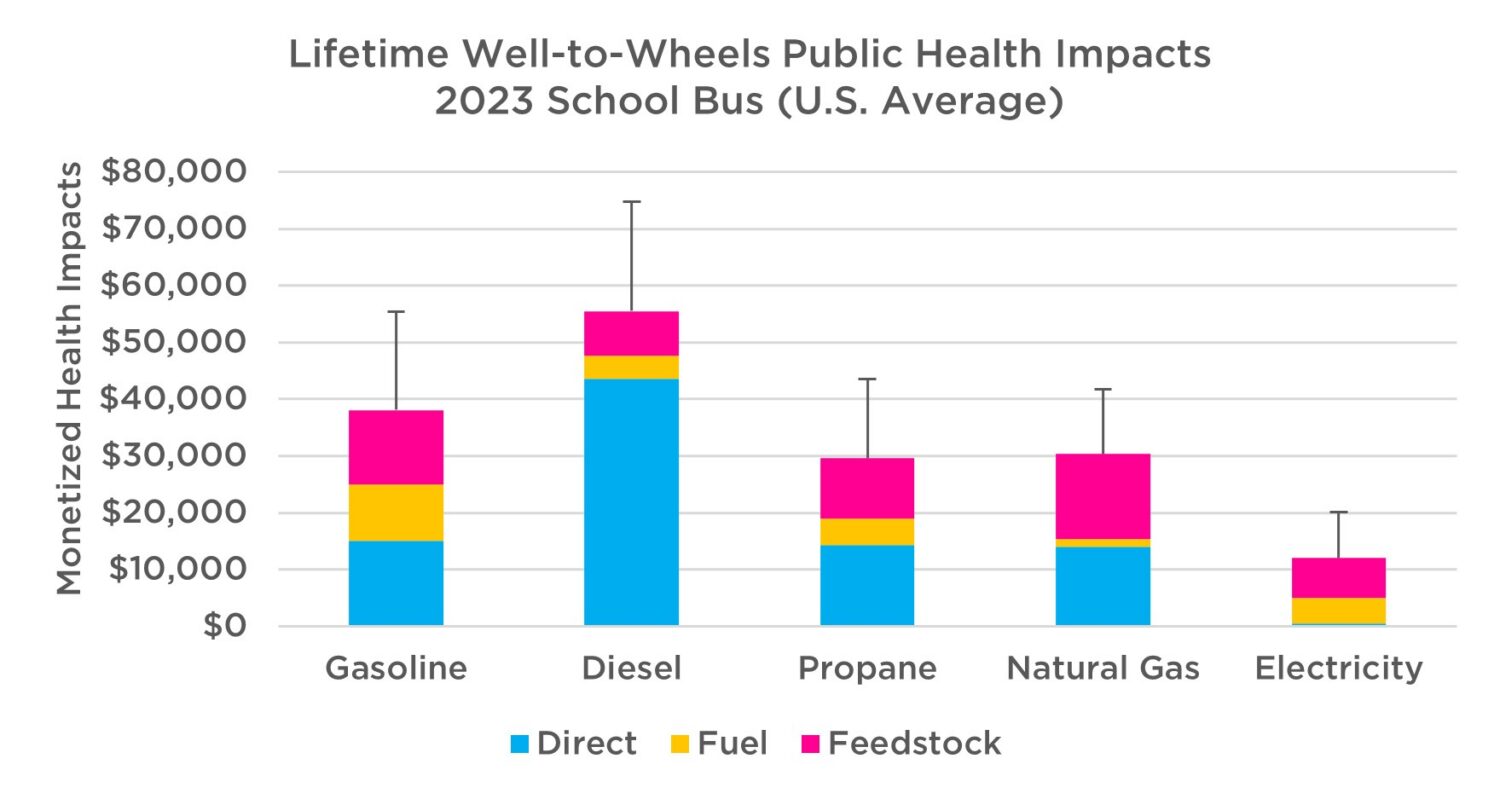 My colleague Dave Cooke recently undertook an analysis to get a clearer picture of how modern school bus options compare for their climate and public health impact. This analysis factors in the tailpipe emissions (“direct” emissions) for combustion engines like gasoline, diesel, natural gas, and propane, and also includes the upstream pollution from extracting (“feedstock” emissions) and refining these fuels (“fuel” emissions).