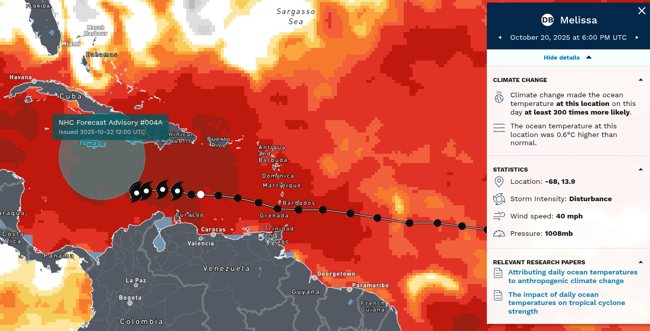 It is mid-morning on October 21, 2025. Tropical Storm Melissa slowly moves west and becomes more organized. Models have not yet converged on its path, but the latest trends have it drifting toward Jamaica, and there is general agreement that 6 to 12 inches of rain could fall on the Dominican Republic and parts of Haiti by Friday with potentially more into the weekend. These three Caribbean nations, together with Cuba, and to a lesser extent Puerto Rico, are at risk of high precipitation and flooding. And the storm clearly has the fingerprint of climate change, according to Climate Central.
