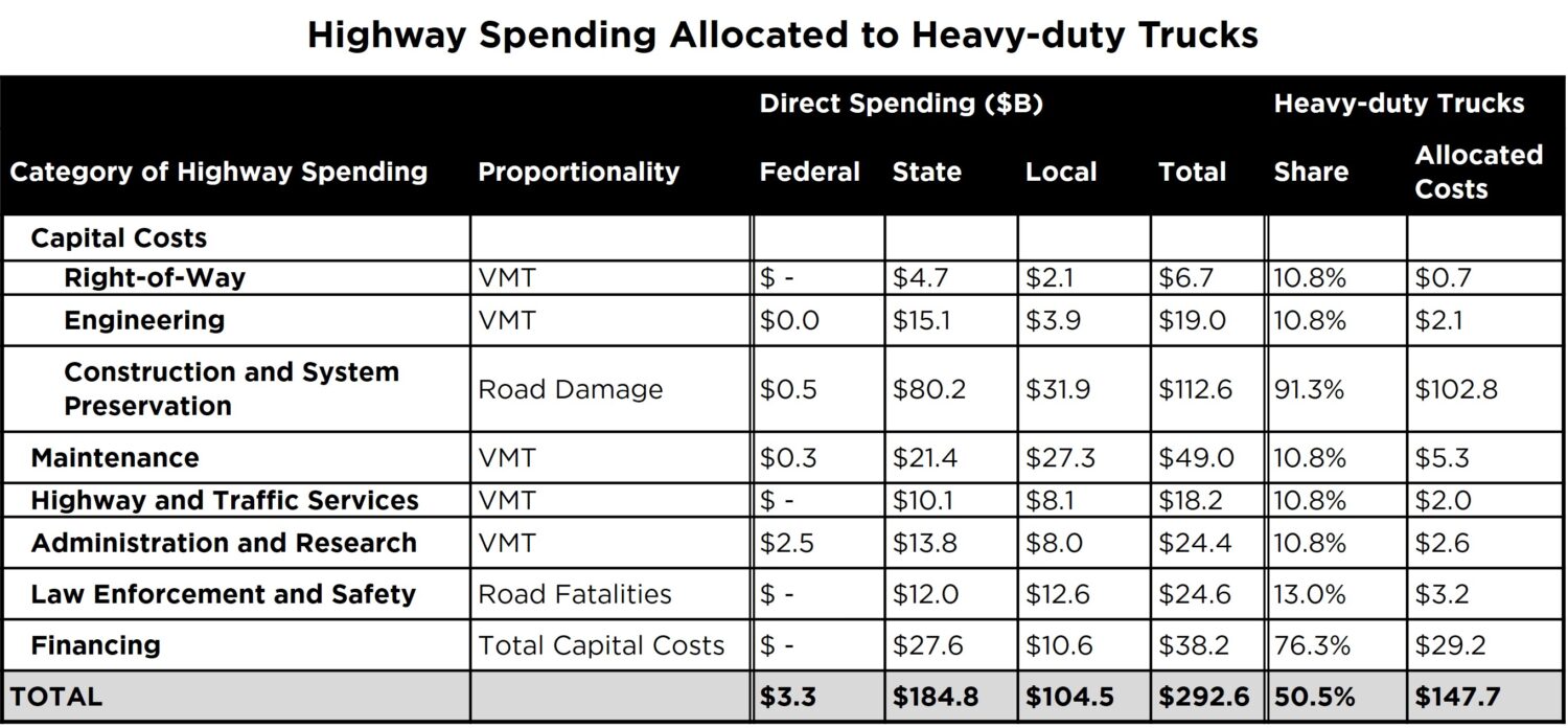 While construction costs are directly related to wear and tear from traffic, some additional highway expenditures are more closely related to traffic flow. For example, it could be argued that research and administrative costs or maintenance of the shoulder could be allocated based on the relative share of vehicle miles traveled. In the case of safety and law enforcement, it would be appropriate to consider the crash risks of the relative vehicles and their safety impacts. But by far the biggest share of highway costs is for construction, which should be proportional to the upkeep of that infrastructure—even when built as new, a project’s costs and amortization all reflect the load-bearing capacity of the traffic it’s being designed to carry.