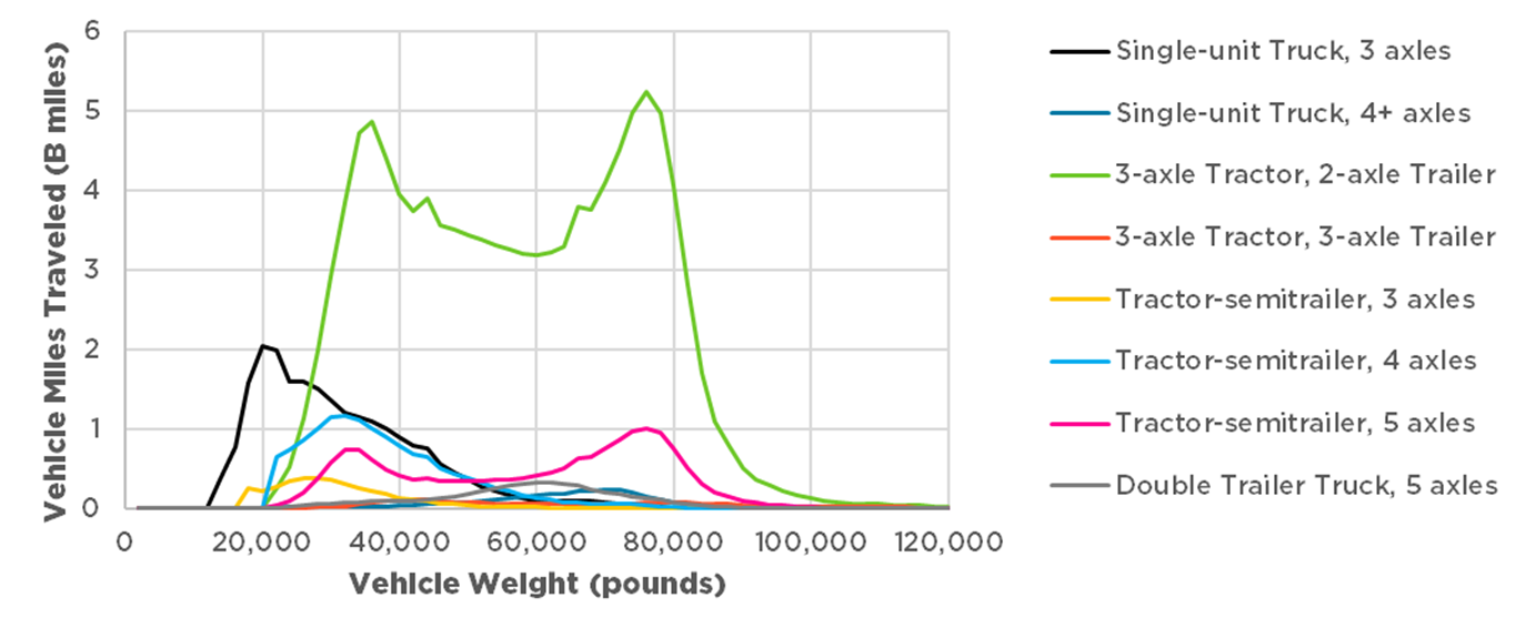 Given the power laws above, we can estimate the relative damage of personal versus commercial vehicles in the United States. The Federal Highway Administration regularly collects detailed data on truck travel in the United States, allowing not just looking at mileage by weight but also by the number of axles on the truck. In this data we see clearly peaks at weights associated with an empty truck (and its trailer), another larger peak in mileage at the maximum federal weight a truck can maintain (for the share of trucking mileage that “weighs out”), and a broad distribution of mileage between (for the larger share of trucking mileage that “cubes out”, or fills its trailer before packing goods to the maximum weight). Supplementing this with data from the Vehicle Inventory and Use Survey for single-unit trucks not captured in this data set as well as curb weight data from EPA for passenger vehicles, we can compare the relative damages. (Further detail is provided in our methodology.)