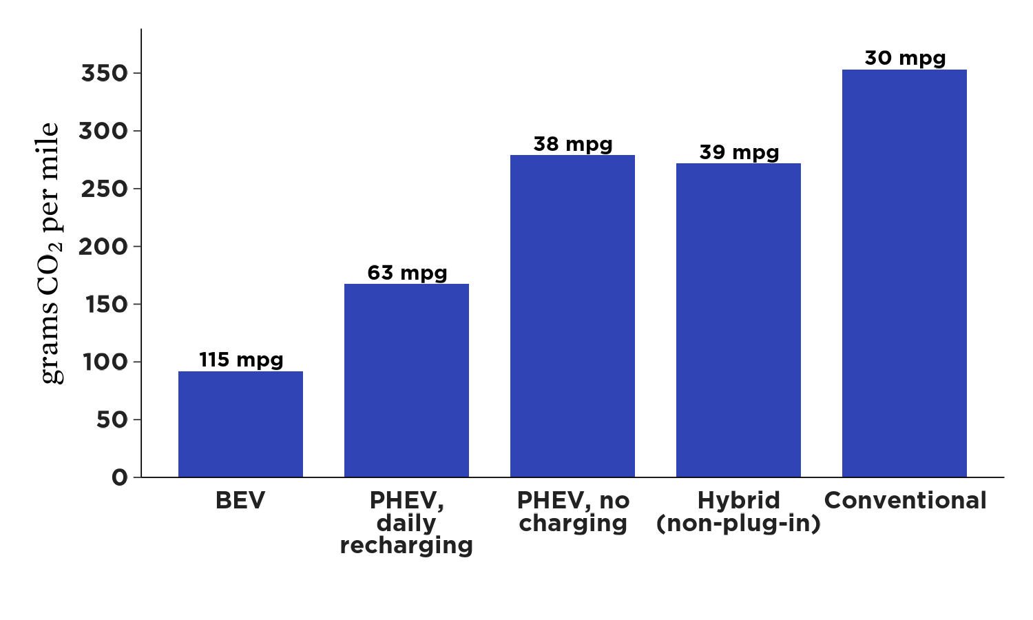 Even when parallel drive PHEVs are plugged in, their emissions are significantly higher than fully electric BEVs, both due to the use of gasoline and the lower efficiency of most PHEVs compared to BEVs. Using US average data, a Toyota RAV4 PHEV when recharged daily would have almost double the global warming emissions per mile than a Toyota bZ BEV. And if the PHEV is not plugged in, the emissions from the PHEV will be triple the BEV emissions.