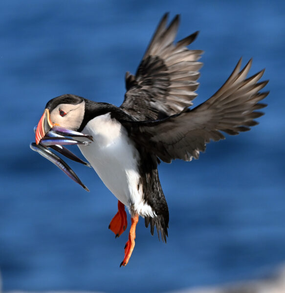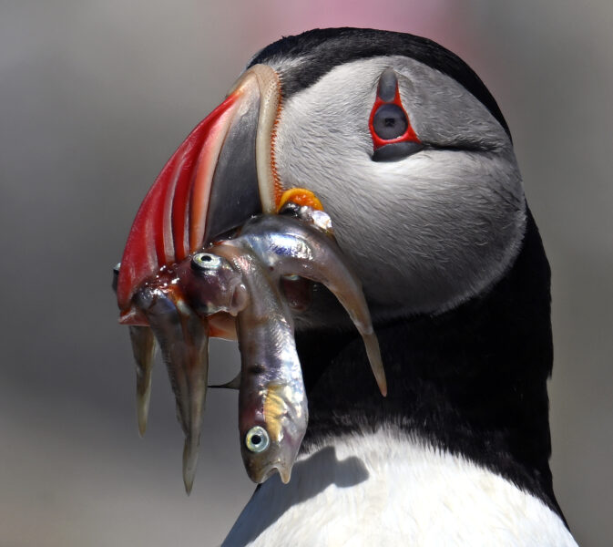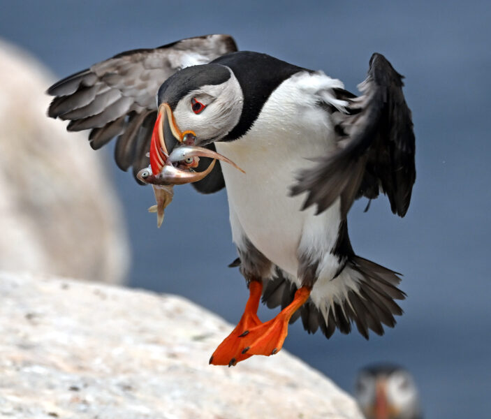 You could not doubt her. In my visit in mid-July, I often had between 100 and 200 puffins stretching across my view from my bird blind. Puffin parents brought in a steady stream of juicy haddock, nice long sand lance, and even occasional herring to feed their chicks. Faber reported to fellow researchers on other islands that many Seal puffin chicks were “big and healthy.” Alcid cousins of puffins, black guillemots and razorbills, had their highest chick productivity ever.