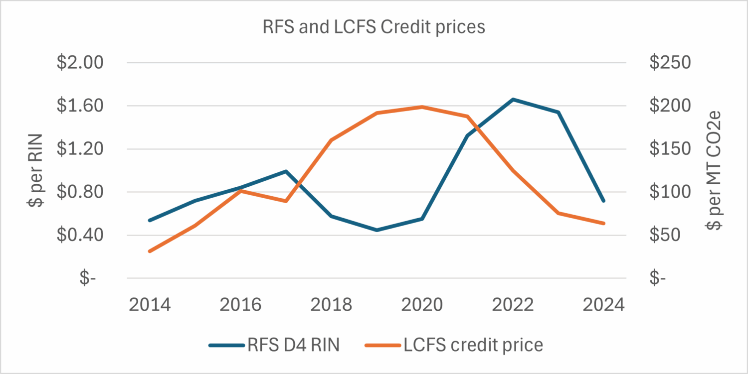 After a decade in which the main policy drivers were stable, policies started to change in 2025. The major changes are described below. The forward-looking incentive stack is uncertain because of uncertain credit prices in the RFS, LCFS and Cap and Trade and because the RFS final rules have not been finalized. 2024 and 2025 are based on reported credit prices, and for 2026 I made simple assumptions in round numbers ($1/RFS D4 RIN, $75/MT LCFS Credit price and $30/MT Cap and Trade).