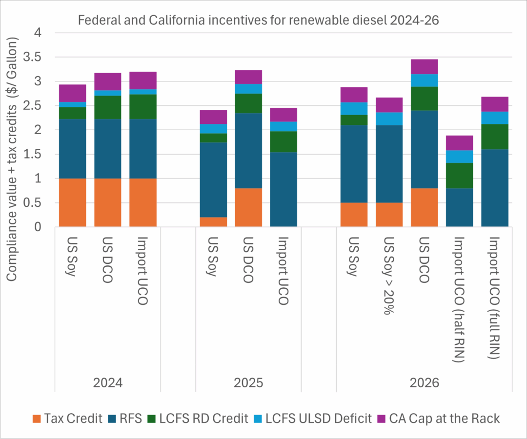 Relative incentives for different feedstocks are also changing, and Federal and state incentives are increasingly pulling in different directions. The biggest changes in 2026 are new federal preferences for domestic feedstocks and for soybean oil. This is in tension with existing disincentives in California for soybean oil, which are ratcheting up with a cap on credits for vegetable oil-based diesel fuels going fully into effect in 2028. The disincentive for soybean oil, combined with logistical factors, had the practical effect of making California renewable diesel producers rely heavily on imports of used cooking oil and animal fats from overseas, at least until 2025. Going forward the changes in federal policy create a tug of war that will reshape the renewable diesel marketplace, although the outcomes remain uncertain because key policy decisions are not final.
