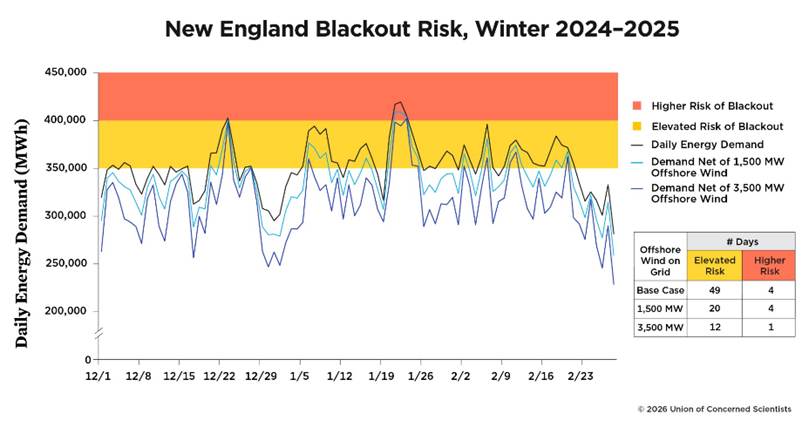That’s also where the new UCS analysis comes in. It focuses on last winter (2024-25) in analyzing offshore wind power’s potential contribution to electricity reliability. It starts with ISO-NE’s own framework for assessing the risk of an “energy shortfall,” when energy supply falls short of energy demand. On a weekly basis in the winter, ISO-NE considers a large set of factors, on both the supply and the demand side, in order to determine when a shortfall is likely.  One important risk factor is “daily energy demand,” which the ISO summarizes with a gauge graphic to illustrate increasing levels of risk. As shown in the graph below, last winter had plenty of days when electricity demand (the black line) was in the yellow elevated-risk zone, and some even in the orange higher-risk levels.