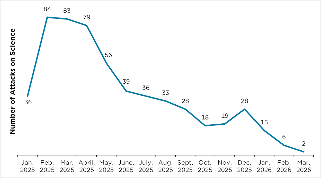 Between January 20th, 2025 and March 6th, 2026, we have tracked and categorized 562 unique attacks on science. Some of the most common types of attacks we’ve documented include: