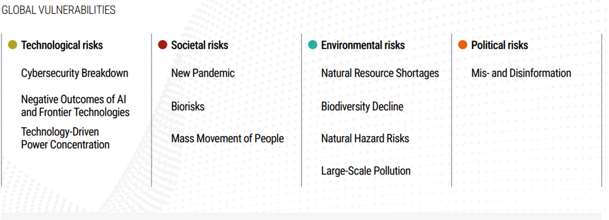 - a suite of risks connected to technology, including from disinformation but also from unregulated AI and cyberwarfare, and