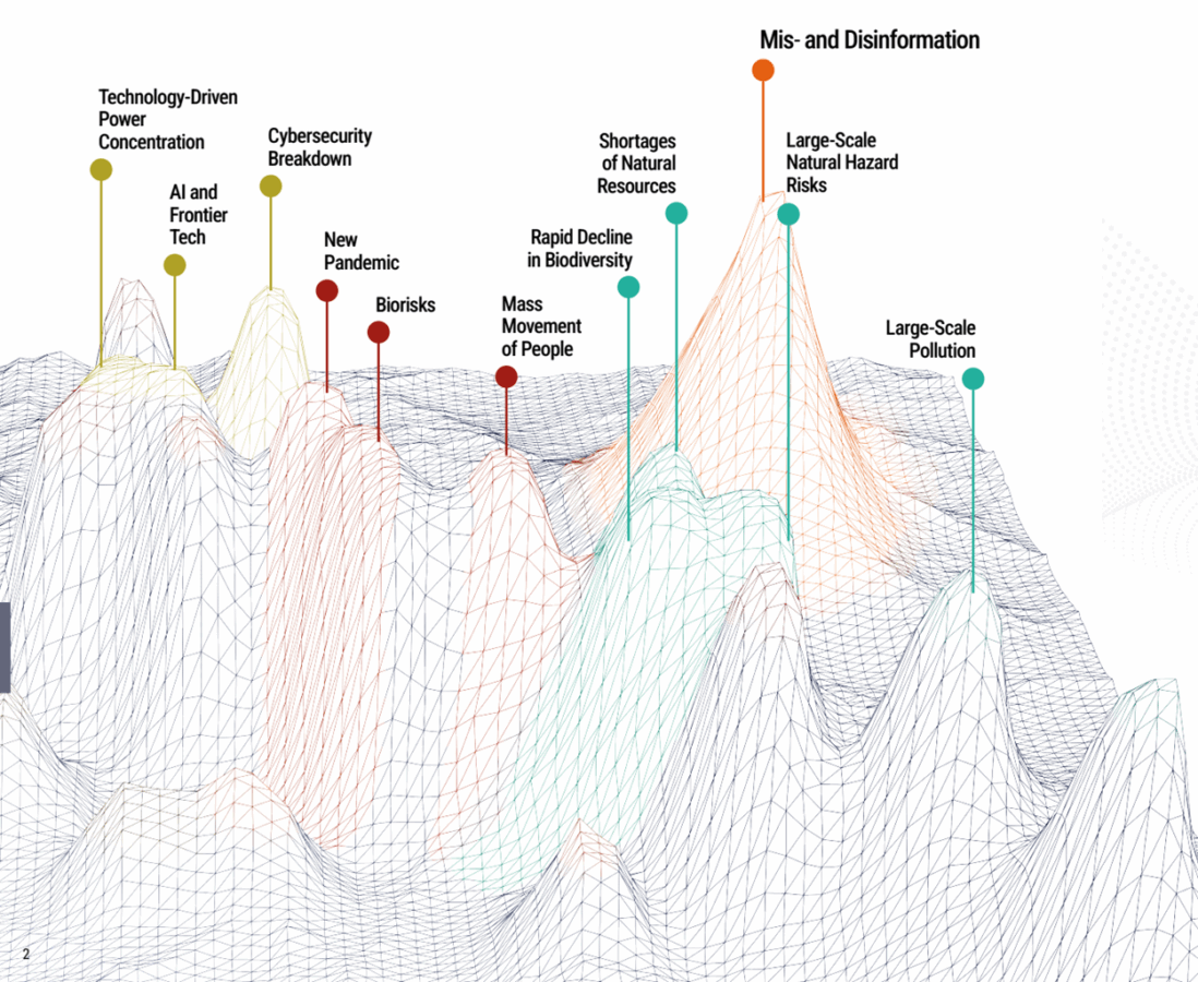 Every year, the World Economic Forum (WEF) collects findings from its Global Risks Perception Survey of 900 experts worldwide to capture insights about the world’s risks over the coming decade. In 2024, and again in 2025, these experts warn that over the next two years, “misinformation and disinformation are biggest short-term risks, while extreme weather and critical change to Earth systems are greatest long-term concern.” As the graph below shows, the experts appreciate:
