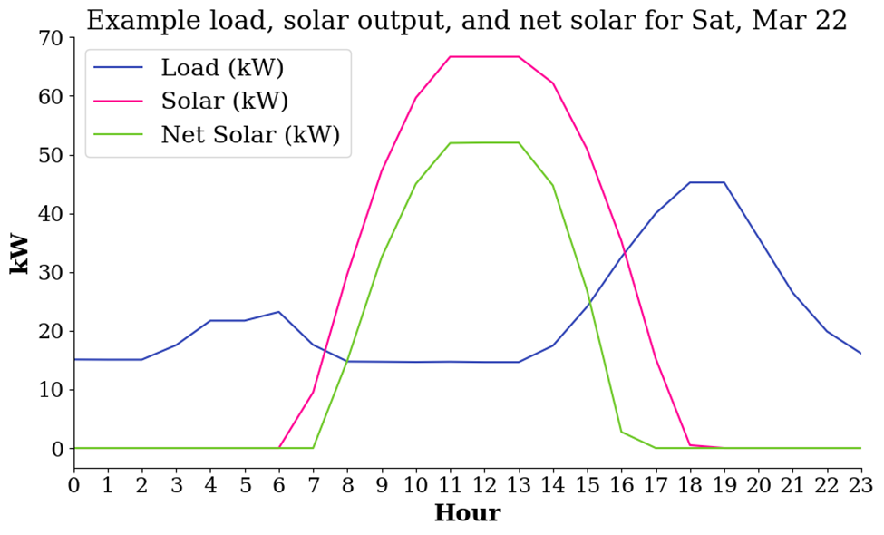 To understand why, consider a typical 50 unit apartment building in Detroit with 80 kilowatts (kW) of rooftop solar panels. On a sunny summer day, the highest output from the solar is about 60 kW—but at the same time, the building uses about 100 kW, meaning there’s no net export to the grid. In fact, the highest net output during the year is about 50 kW on a typical spring day, shown below.