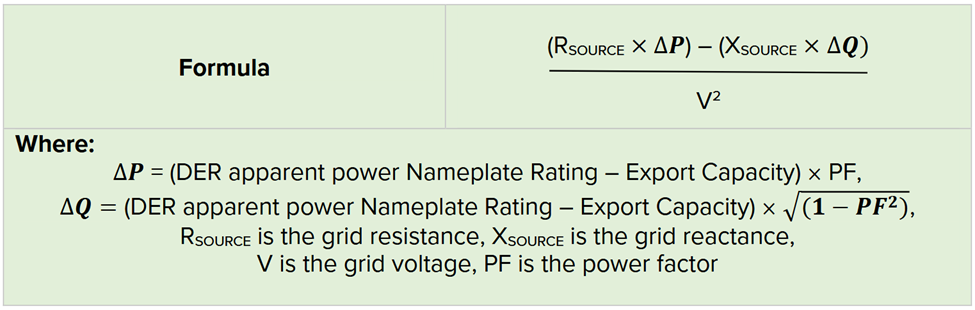 The BATRIES team developed the screen to address a gap in the typical screening process that applies to export-limited projects. The limit for the initial penetration screen (15% of peak load) is set to account for the impact of DERs on grid voltage. But if some portion of the DER capacity is export-limited, it’s possible for voltage to rise above acceptable limits during an inadvertent export event, when the active capacity can momentarily exceed the 15% limit. The voltage screen for export-limited projects addresses this risk by estimating their impact on grid voltage, using the formula below. If the voltage change exceeds 3%, then the project fails the screen and must undergo further study.