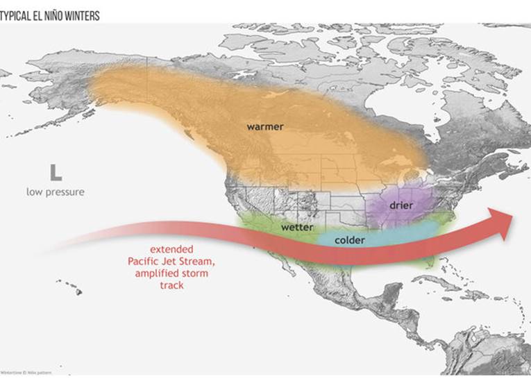 El Niño events affect weather patterns around the world, including here in the United States. The figure below highlights these changes during an El Niño: the northern part of the country usually experiences warmer weather than normal, and the southern part of the country is usually wetter and cooler than normal.