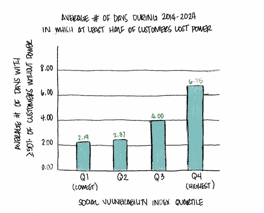 The data shows that counties in the highest SVI, those counties with the highest levels of vulnerability (quartile), experienced more than twice as many days in which at least half of customers lost power as counties in the lowest quartile, underscoring that social vulnerability is closely associated with a greater outage burden. These are communities navigating language barriers, disability, housing insecurity, income constraints, and transportation gaps—while also absorbing the longest stretches without power.